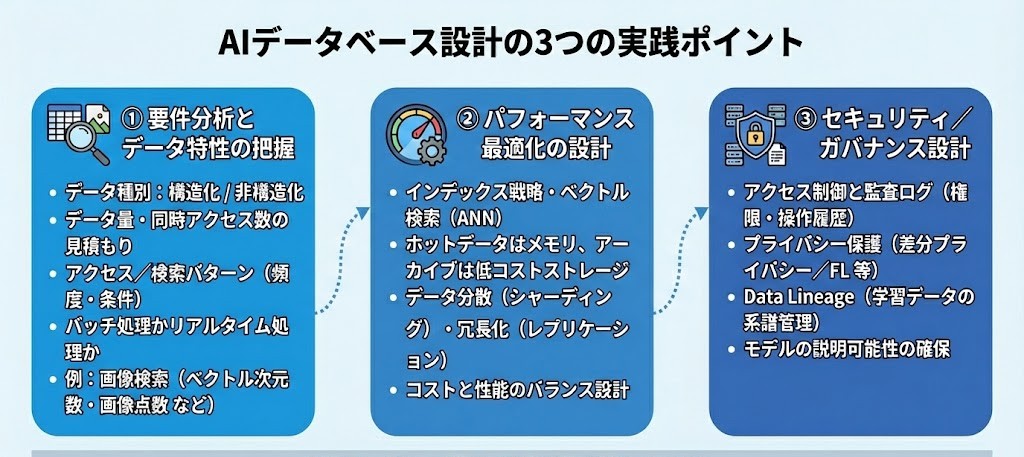 AIデータベースの設計は、AI特有の要件を理解し、データの特性に応じた最適な設計を行うことが成功の鍵となります。以下では、実践的な設計ポイントを段階的に解説します。
