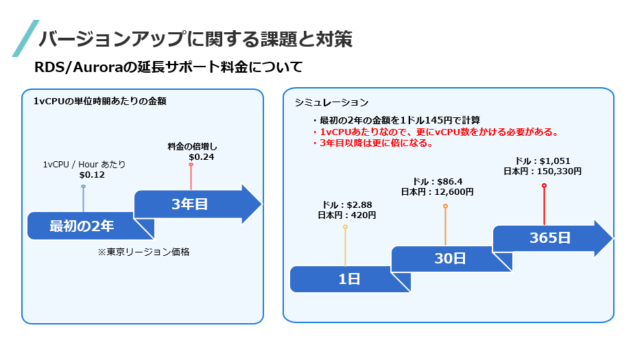 - 現行バージョンを延長サポート終了日まで使い続けるにはRDS/Auroraの延長サポート料金がかかる