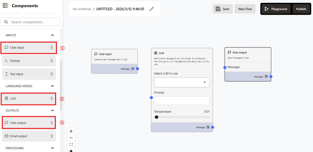 ⑭LLMの「Message」横の青丸とChat output横の「Message」の青丸をドラッグして線を繋げます。