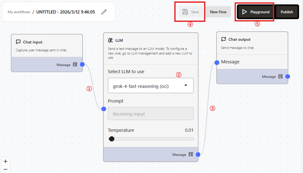 ③LLMの「Message」横の青丸とChat output横の「Message」の青丸をドラッグして線を繋げます。