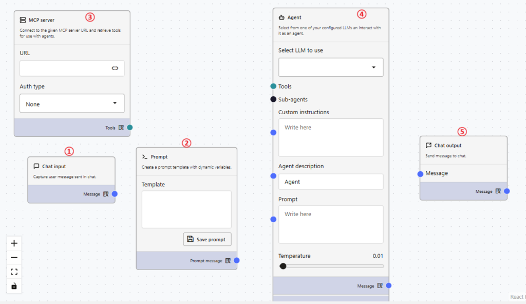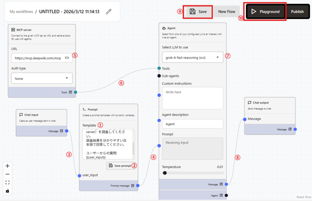 ⑧Agentの「Message」横の青丸とChat output横の「Message」の青丸をドラッグして線を繋げます。
