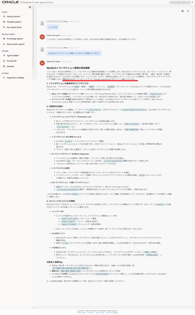 実際にMySQL Serverのリポジトリを参照して回答している様子が伺えます。