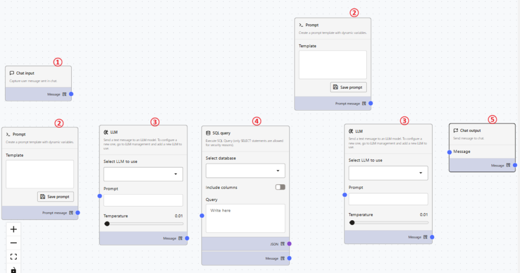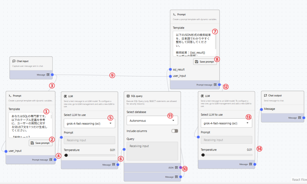 ⑥LLMの「Message」横の青丸とSQL queryの「Query」横の青丸をドラッグして線を繋げます。