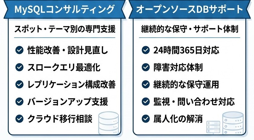 MySQLの保守運用を外部に任せる場合、「データベース全般対応」と「MySQL専門」ではサポートの深さに差が出やすいのが実情です。